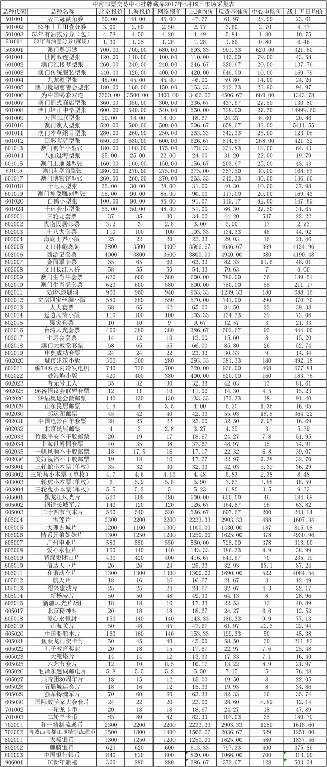 您的当前位置: 首页 > 邮币卡资讯 >中南邮票交易中心挂牌藏品2017年4月19日市场采集表