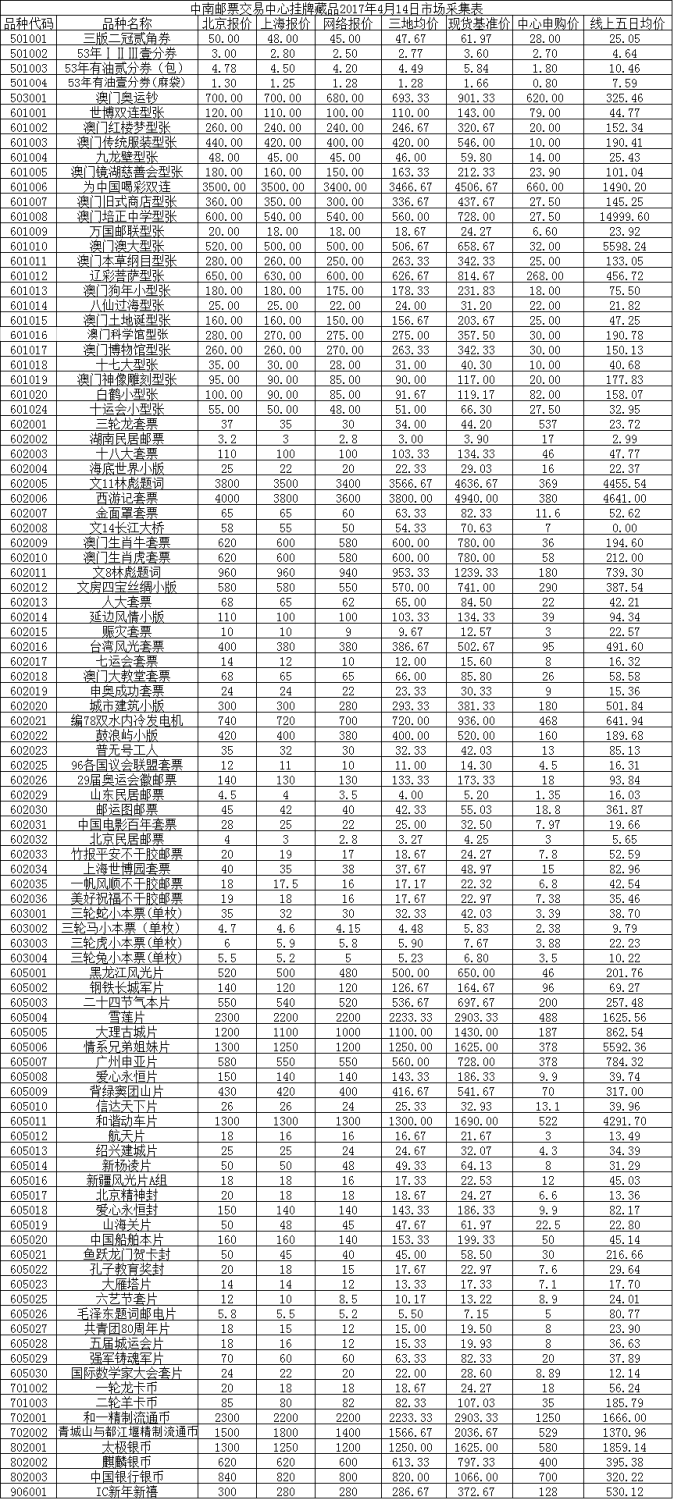 您的当前位置: 首页 > 邮币卡资讯 >中南邮票交易中心挂牌藏品2017年4月14日市场采集表