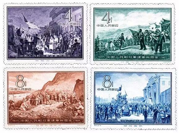 1957年8月10日,正值庆祝"八一"建军节之际,中华人民共和国邮电部发行“中国人民解放军建军三十周年”纪念邮票。这套邮票由于采用少见的大型票幅和雕刻版印刷,立体感强,显得气势恢弘,真实地再现了人民军队从南昌起义、井冈山会师、东渡黄河抗击日寇到解放南京、推翻蒋家王朝这段辉煌的战斗历程。原稿均是油画,以雕刻版印制后,别具一格。