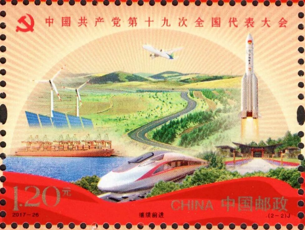邮票第二图通过“复兴号”高铁、风力发电、太阳能、国产C919大飞机、“2017一带一路国际合作高峰论坛”主会场、火箭等元素,展现了十八大以来我国在政治、经济、科技、生态文明建设等方面取得的辉煌成就,突出“一带一路”重要战略,贯彻创新、协调、绿色、开放、共享的发展理念,以此体现中国共产党带领中国人民不断把实现中华民族伟大复兴事业推向前进。