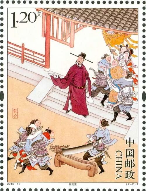 中国邮政于2015年8月8日发行《包公》特种邮票1套2枚,小型张1枚,全套邮票面值为8.40元,志号2015-16。邮票内容分别为掷端砚、铡美案,小型张内容为包公像,同时发行小型张丝绸四连张,辽宁省沈阳邮电印刷厂印制。